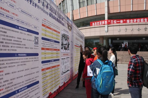 今年,我校“三位一体”招生综合素质测试采用面试的形式,分单人面试和无领导小组讨论,主要考察考生的综合素质,如领导能力、沟通能力、团队意识、逻辑思维、人文素质、创新精神、专业素养等方面。教务处处长孙卫红说,学校从400位考官当中,随机抽选了100多位考官参与面试,其中大部分是学校的专家教授,还有部分是各个领域出类拔萃的校外考官,他们有的是知名校友、有的是企业HR,有的是人才市场方面的专家,综合性的考官组成,有助于全方面、多角度地考察应试学生的综合素质。