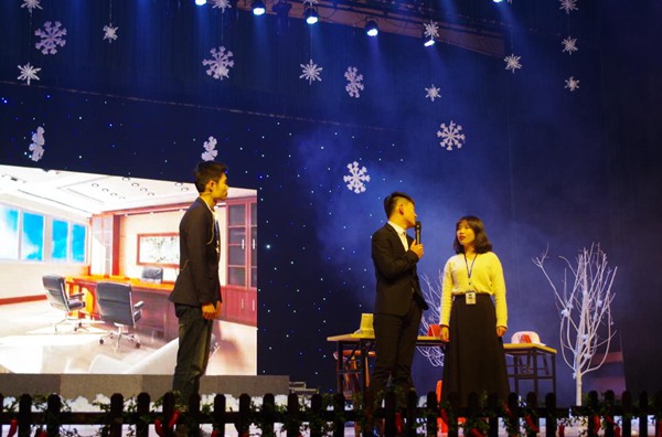 在嘉宾表演环节,校长林建忠老师不仅给研究生送来了新年祝福,用“衣带渐宽终不悔”、“朝如青丝暮成雪”、“少小离家老大回”等古诗词为谜面让大家猜歌曲名与研究生互动,猜中者更是得到了林校长精心准备的小礼物。互动之后,林校长为大家演唱了歌曲《一剪梅》,声音醇厚、质朴,赢得了在场研究生的欢呼、呐喊,将晚会气氛推入高潮。