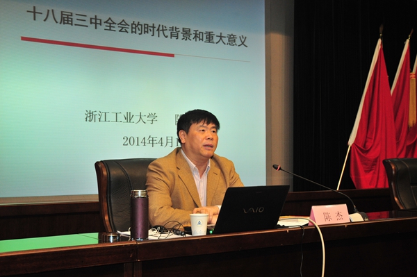 报告会上,浙江工业大学副校长陈杰作了题为《十八届三中全会的时代背景和重大意义》的辅导报告。他以深厚扎实的功底、精辟独到的见解、生动翔实的事例,深入浅出的解读了十八届三中全会召开的时代背景、中国改革的历史方位和全会的重大意义、《决定》的总体框架和主要内容,既有理论高度和实践深度,又有很强的针对性和指导性,对于学员深刻认识和准确把握全会精神起到了重要的引领作用。