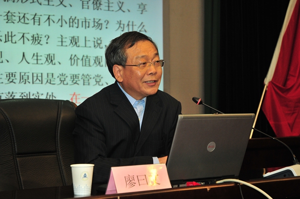 廖曰文以《坚持党要管党、从严治党,永葆党的先进性和纯洁性——学习习近平关于党的建设的重要论述》为题,就学习习近平总书记关于党的建设讲话精神,全面提高高校党建工作科学化水平进行了专题辅导。从习近平总书记对党建工作的反思,廖曰文提出“党要管党,才能管好党;从严治党,才能治好党”。他从世情、国情、党情等方面的深刻变化,分析了强调党要管党、从严治党的现实背景,指出:党要管党、从严治党,要落实到“五个加强”。一要以坚定理想信念为重点加强思想建设。二要以造就高素质党员、干部队伍为重点加强组织建设。三要以保持党同人民群众的血肉联系为重点加强作风建设。四要以健全民主集中制为重点加强制度建设。五要以完善惩治和预防腐败体系为重点加强反腐倡廉建设。