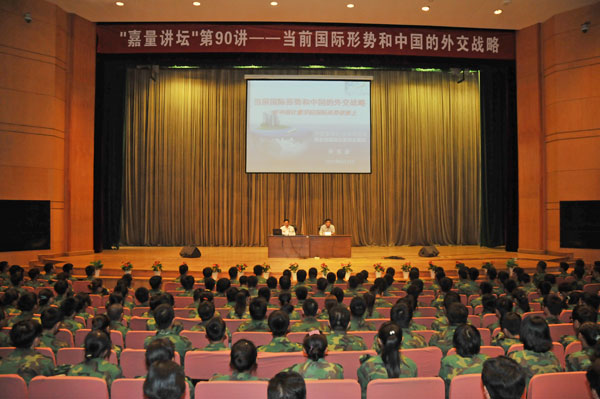 9月4日下午,外交部条约法律司司长黄惠康应邀做客嘉量讲坛,以《当前国际形势和中国的外交战略》为题,为我校师生带来了一场精彩的报告。作为2013年暑期中层干部学习会的专题之一,全体中层和1000余名学生一起聆听了报告。报告会由校党委书记胡建成主持。