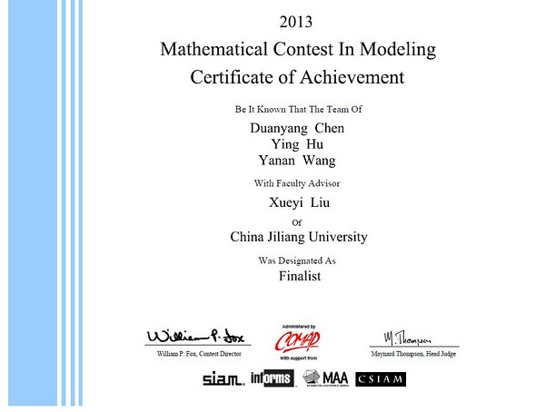 2013年国际大学生数学建模竞赛(含交叉学科竞赛,MCM&ICM)结果日前揭晓,我校组织的19支参赛队在本次比赛中获得提名特等奖1项(Finalist)、国际一等奖6项(Meritorious)、国际二等奖7项(Honorable Mention)的优异成绩,总成绩位居浙江省属高校之首。今年共有来自美国、加拿大、英国、德国、中国等14个国家和地区的6593支队伍参与了本次赛事各种奖项的角逐。其中全球仅有36支队伍获得特等奖和提名特等奖,不到参赛队总数的0.6%。