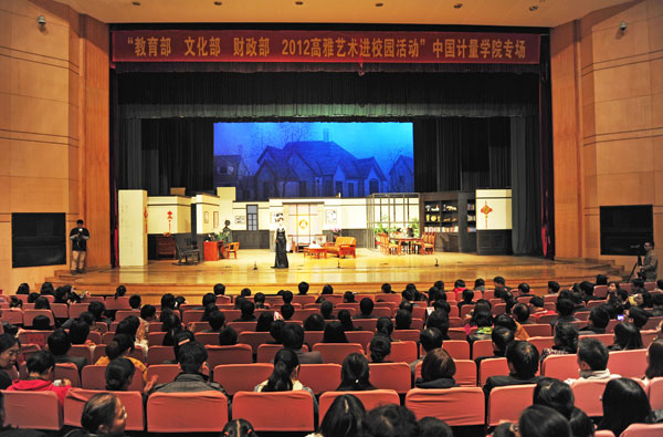 为进一步推进高雅艺术进校园活动,丰富校园文化生活,提高学生艺术修养,11月14日晚,由教育部、文化部、财政部主办的2012全国高雅艺术进校园——国家话剧院中国我院学院专场在嘉量大会堂隆重上演。