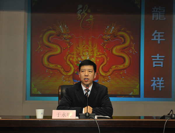 于永明书记就如何推进2012年各项工作,作了题为《凝心聚力 克难攻坚 努力实现新跨越》的讲话。他指出,要认清发展机遇和挑战,增强紧迫感和责任感,锐意进取,奋发有为。其次,主动设计,行政推动,整合资源,争取大项目、大平台、大团队、大成果的新突破。强化行政推动,建立重点项目校领导联系制度。再次,狠抓落实,加强监管,强化奖惩,努力提高人才培养质量。认真落实教学工作会议各项制度措施。第四,深化产学研合作,瞄准重点行业企业,着力推动科技成果产业化。主动与政府、行业企业建立合作联盟,形成横向科研项目的规模优势。第五,以人才为本,着力培养和引进学科带头人,完善团队建设机制,建立高水平师资队伍。第六,积极开拓,加强沟通,扩大影响,争取政府、企业和同行更多的支持。第七,预防在先,做深做细,确保学校安全稳定。加强舆论引导和讲座、论坛的管理,加强实验室安全管理。第八,尊重关心信任教职工,公正公平公开办事,营造心情舒畅的内部环境。让贡献大的教职工在学校有地位和受到尊重。最后,他殷切希望各学院、各部门齐心协力,圆满完成学校2012年各项工作任务。