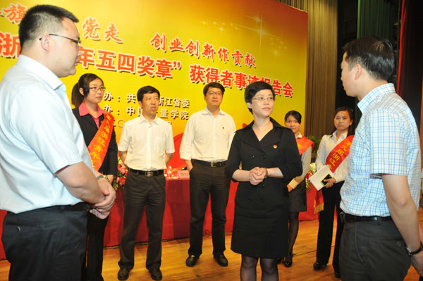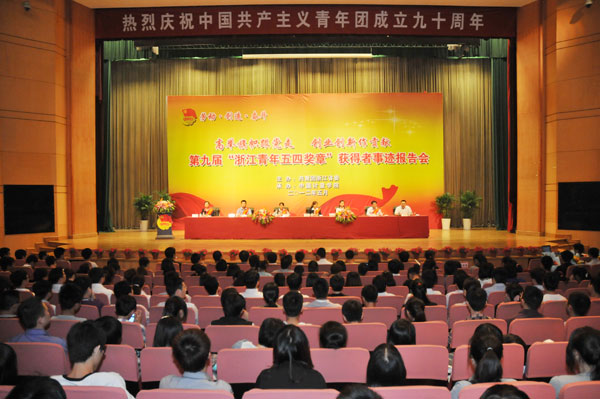 为纪念中国共产主义青年团成立90周年,5月2日,第九届“浙江青年五四奖章”获得者先进事迹首场报告会在我校嘉量大会堂举行。本次报告会的主题为“高举旗帜跟党走,创业创新作贡献”,由团省委主办,我校承办。团省委书记周艳,我校党委书记于永明、党委副书记陶伟华,团省委副书记王征、朱斌和部分机关干部代表,下沙高教园区大学生代表共1200余人认真聆听了报告。
