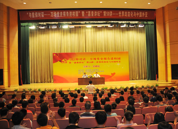 9月24日下午,由共青团中央、全国学联主办,共青团浙江省委和中国我院学院承办的“与信仰对话——万场党史报告进校园”活动在嘉量大会堂隆重举行。资深外交家吴建民为师生做了《世界的变化与中国外交》专题报告,校党委副书记陶伟华主持报告会。来自我校和下沙高教园区的1200余名师生代表参加了讲座。