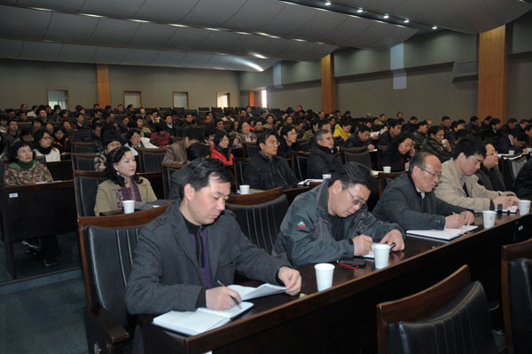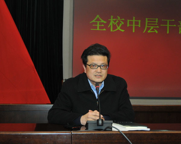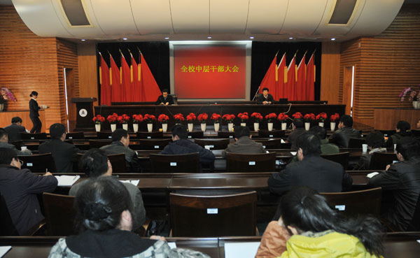 在完成了新一轮中层干部换届工作后,我校于3月23日召开了2011年首次全校中层干部会议,总结成绩,部署下一步工作。校长林建忠,校党委副书记徐涌金、陶伟华,副校长蒋家新、冯时林、俞晓平,校党委委员陈希武、范庆瑜出席了会议,全体中层干部,校级以上(含校级)重点学科带头人,民主党派负责人,正、副处调研员,各学院(部、中心)办公室主任参加了会议。