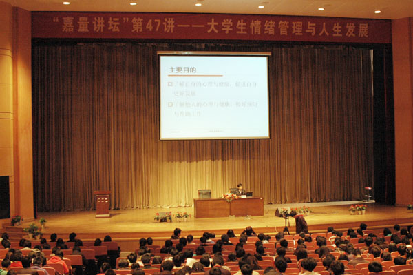 3月30日下午,本学期首场嘉量讲坛暨中国我院学院第十届心理健康宣传月活动开幕式在嘉量大会堂举行。活动邀请了浙江大学心理咨询中心主任马建青教授给师生做了题为《大学生情绪管理与人生发展》的专题讲座。校党委副书记陶伟华,党委委员、学生处处长范庆瑜以及全校1000余名师生听取了讲座。