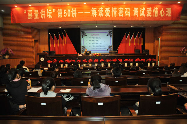 为引导大学生树立正确的恋爱观,解决同学们在日常生活和学习中遇到的关于恋爱的烦心事,我校嘉量讲坛特邀首都师范大学教授、中国心理学会首批认证的全国百名注册心理师之一、北京电视台《生活广角》栏目的特邀心理专家杨芷英来校讲座,为同学们解读爱情密码,调试爱情心理,与大家分享寻找爱情、把握爱情的技巧。