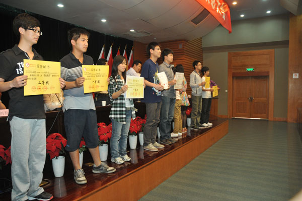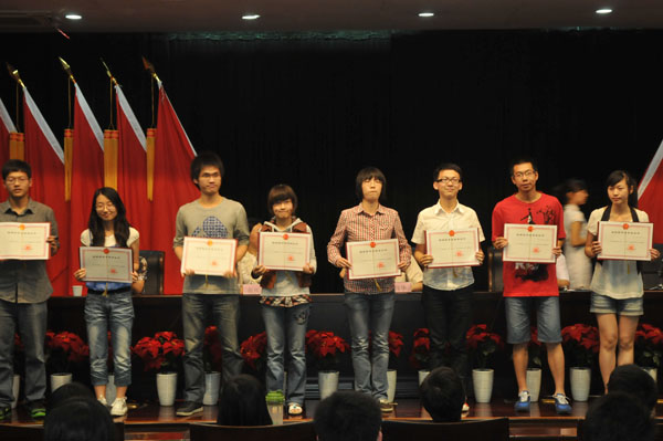 会议首先由陶伟华副书记宣读获奖表彰文件,对获得194项A类学科竞赛、291项B类学科竞赛奖励的同学及指导教师,33位国家奖学金获得者、405项国家专利获得者、4项大学生舞蹈节表演奖及5个优秀学生社团获奖学生进行表彰。校领导和有关职能部门负责人为115位获奖学生代表颁发了证书。