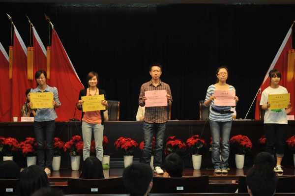 5月27日,我校在闻厅二楼小报告厅隆重召开2010年学生表彰大会,对荣获2010年校级以上学科竞赛、2009—2010学年国家奖学金、2010年国家专利、2010年浙江省大学生舞蹈节、浙江省十佳学生社团、浙江省优秀学生社团奖励的同学进行了表彰。校党委副书记陶伟华、副校长宋明顺出席了大会,有关职能部门负责人,各二级学院分管学科竞赛领导、指导教师、受表彰学生、参加2011年A类学科竞赛集训同学以及各学院学生代表参加了大会。大会由教务处处长潘岚主持。