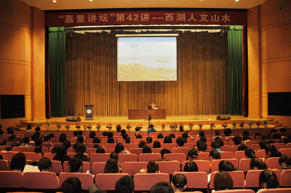 10月21日晚6点,国家高级导游员耿乙匀走进我校“嘉量讲坛”第42讲,以《西湖人文山水》为题,为师生们带来了一场别开生面的讲座,带领大家认识西湖,了解西湖,游览西湖,欣赏西湖之美。