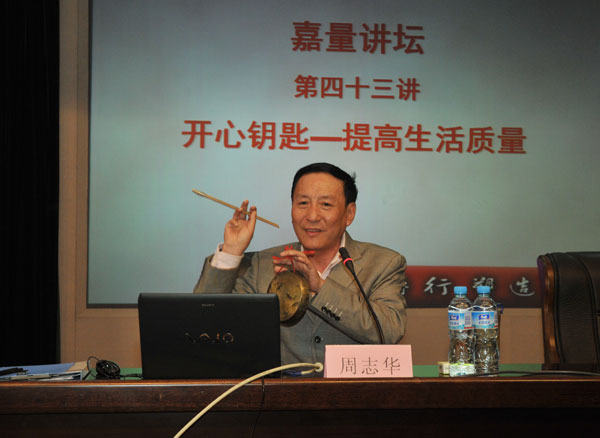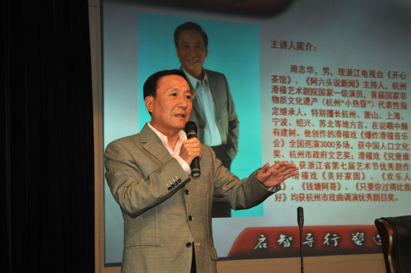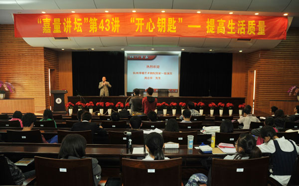 作为快乐的传播者,幸福的播种者,周志华老师在讲座中与同学们分享了什么是幸福,怎样才能开心、幸福?他通过几段杭州“小热昏”的表演,“阿六头说新闻”中的案例分析以及《弟子规》的解读,让同学们再次感受到了幸福的真谛,以及君子爱财取之有道,百善孝为先等做人的基本道理。周志华说,幸福是一种开心的感觉,人的一生要想开心、惬意,首先要学会好好做人,尤其是广大青年人更要切忌浮躁,要关心父母,尊重师长,心存感恩,在社会上清清白白做人,正正当当干事,这正是打开开心之门的钥匙,也是收获幸福的根本。