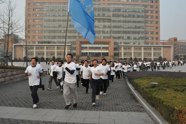 “在新年的起始点,让我们因跑步、因锻炼而身体健康,让我们因环校、因爱校而工作学习生活愉快,让身体健康、生活愉快的我们推动中国我院学院跑步前进。”下午15:30,林建忠校长简短的新年祝词拉开了我校2011年师生新年环校跑的序幕。于永明、林建忠、陶伟华、俞晓平、宋明顺等学校领导和2000名师生一起跑步环校一周,以期新年学校有新气象,新年师生有新收获。