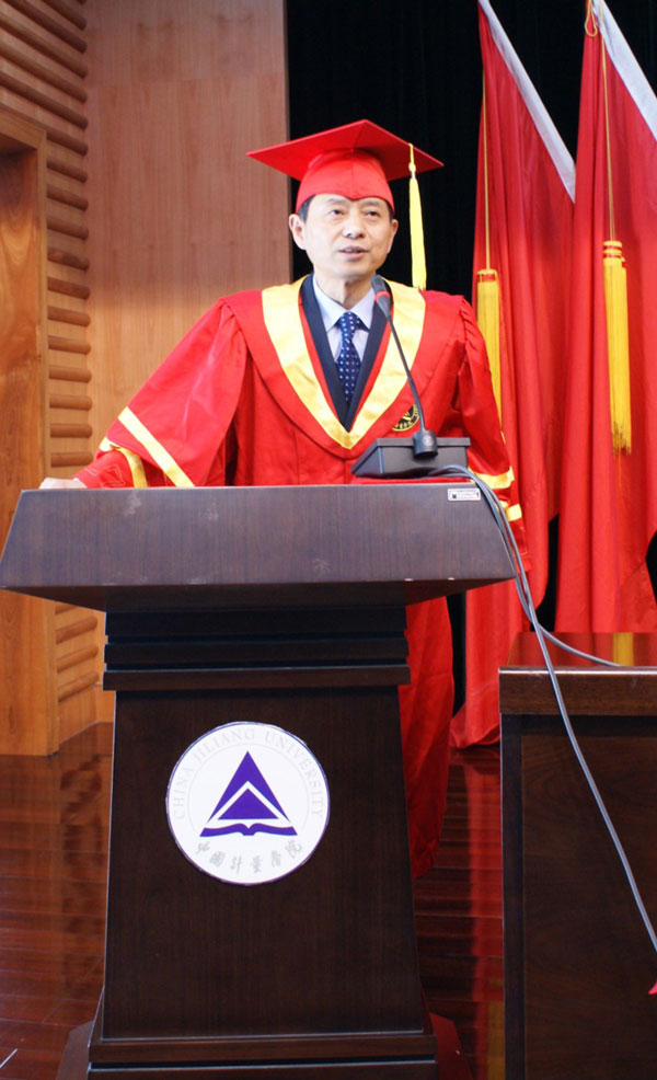 计测学院教师叶树亮代表导师发言。他向获得硕士学位的研究生表达了衷心祝愿,希望他们常怀感恩之心,始终具有强烈的使命感和责任感,不断学习,持续提升自身的社会竞争能力,为社会做贡献,为母校争光。