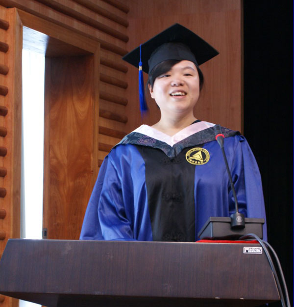 毕业研究生杨觅玫代表全体硕士学位获得者对母校和老师的辛勤培育表示最诚挚的谢意,表示要谨记学校和导师的忠告,“精思国计、细量民生”,服务社会、实现自我价值,做优秀的我院人。