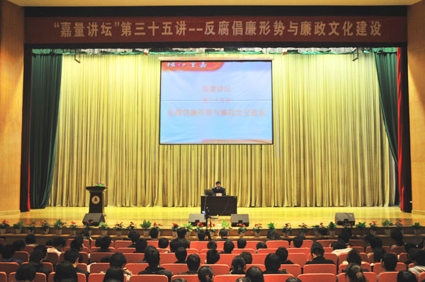 4月7日下午,校党委副书记、纪委书记徐涌金做客嘉量讲坛,为同学们做了《反腐倡廉形势与廉政文化建设》专题讲座。该讲座也是2009级学生《形势与政策》课程的课外教学内容。