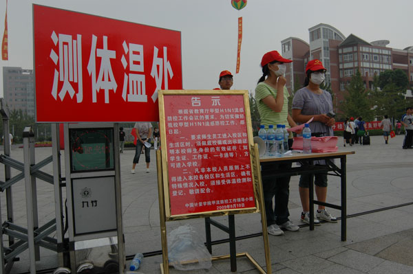 由于近日杭城甲型H1N1流感防控形势严峻,受此影响,新生报到第一天,学校的老师、保安、医务人员全部严阵以待。全校迎新工作人员须自行测量体温,检测正常后方可参加迎新接待工作。