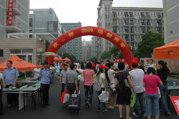 学校专门安排了车辆分兵6路,赶往杭州的两个火车站和四个汽车站,同学们一出站就能够安全方便地直接来到学校。学校大门口,青年志愿者们戴着小红帽,为新生报到提供着“一对一,一条龙”的周到服务。在各个学院的报到处,工作人员热情紧张地为每一位前来报到的同学服务,让每位同学顺利地完成入学的各种手续。