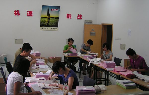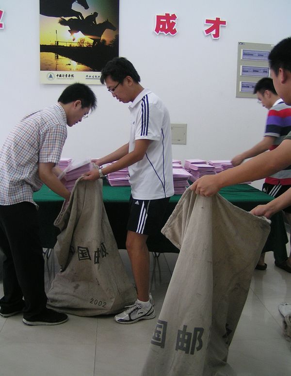 每个省份、每一批次录取结束后,学校都要及时公布录取结果、寄送录取通知书,并随通知书寄送《高等学校学生资助政策简介》,保证把国家的助学政策宣传到每位新生。现场忙碌而又井然有序。这样的场景在我校及独立学院浙江省第二批录取了3000多名考生后,就可以用“壮观”来形容了。