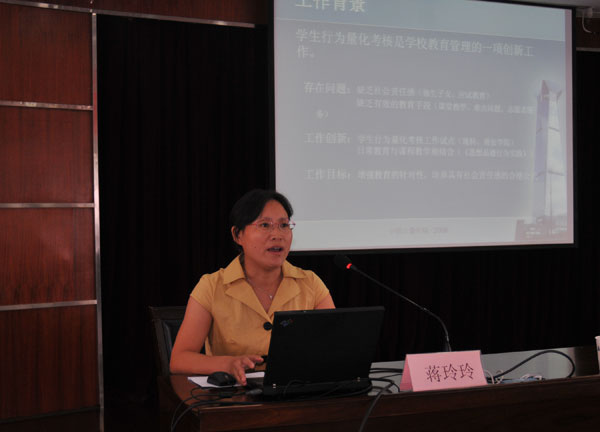 学生处副处长蒋玲玲向与会人员介绍了《中国我院学院学生行为量化考核管理办法》的实施办法。