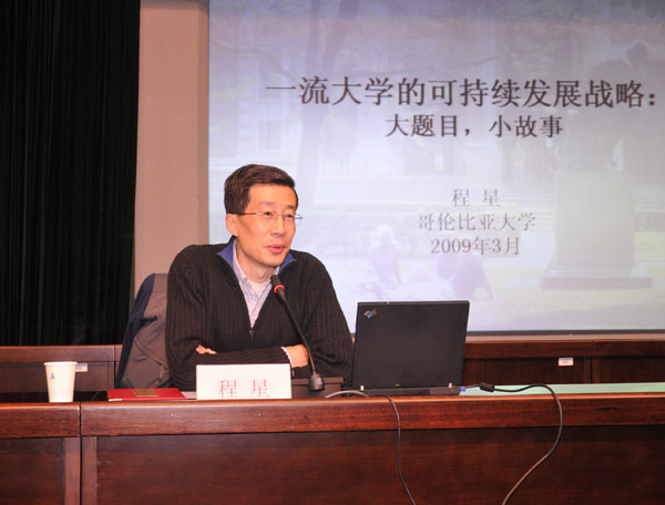 程星博士以全新的理念和深入浅出的语言为大家讲述了什么是可持续发展战略、现代大学的立校之本和大学可持续发展的关键。程星认为,大学的可持续发展既要着眼于目前求发展、创一流,又要为未来的持续辉煌打下坚实的基础。大学可持续发展的关键还在学生。他对哥伦比亚大学的发展历程进行了案例剖析,指出大学实现可持续发展要将本科生教育作为工作重点,善待在校的学生;要意识到校友工作的重要性,与校友保持紧密联系,精心培育校友对母校的忠诚度。同时他还对大学筹资与大学的可持续发展进行了阐述。“教授就是大学、学生就是大学”,“不要忽略对未来的规划,轻视与校友的联系”,“不要重大师、重科研,轻本科、轻校友”,“大学未来的发展不是十几二十年,而是更加长远”,程星博士与大家共同分享了大学可持续发展的经验体会。
