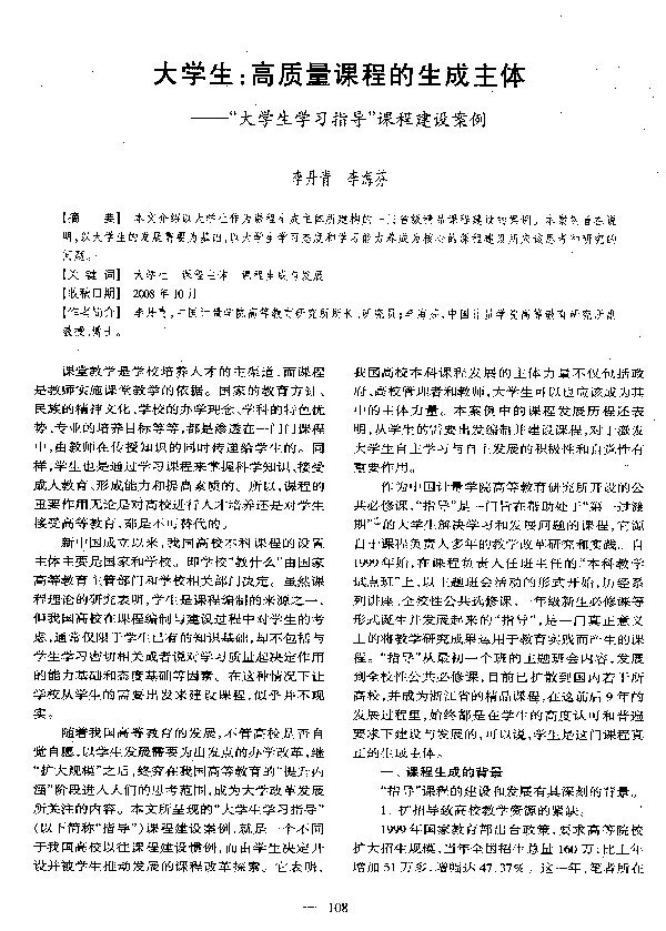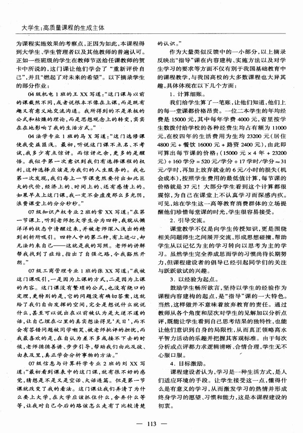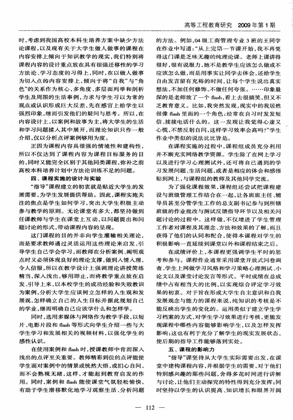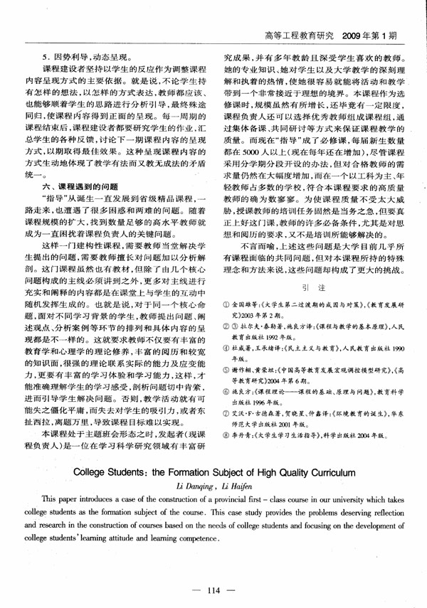 《高等工程教育研究》2009年第1期刊登了我校高教研究所李丹青等撰写的文章“大学生:高质量课程的生成主体”,并列为要目,这是我校成为《高等工程教育研究》微观研究约稿单位之后,完成的首篇约稿。该文章是一篇关于省级精品课程《大学生学习指导》的生成与发展案例。文章从课程产生的背景、课程设计理念、课程内容选择的哲学与现实基础、课程实施的设计与实验、课程的影响力、课程遇到的问题等六个方面详细阐述了该课程生成与发展的过程,并以翔实的材料证实了大学生在课程设计和实施中发挥的作用。尽管该文章是从某一类型的课程案例来展现大学课程产生、发展的规律和特点的,但其所揭示的规律和特点绝大部分都是各类课程通用的,因此具有良好的借鉴性。