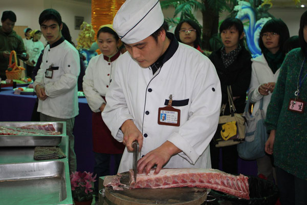 12月4日下午,G3餐厅四楼人声鼎沸,热闹非凡。大厅内一根根精心装饰的亭柱,展台上一道道令人垂涎的美食,一张张热情洋溢的笑脸,无不烘托出喜庆的节日气氛。由后勤服务公司餐饮服务中心主办的中国我院学院第九届美食文化节暨餐饮服务中心第二届职工技能比武在此隆重举行。校党委书记于永明、副校长蒋家新等学校领导,党委宣传部部长姜羡萍、学生处处长范庆瑜、校团委书记刘秀丽等嘉宾以及后勤服务公司负责人应邀参加了开幕式。 于永明书记宣布中国我院学院第九届美食文化节暨餐饮服务中心第二届职工技能比武开幕。于永明书记和蒋家新副校长还共同为开幕式剪彩。开幕式上,蒋家新副校长为开幕式致辞,在致辞中他对后勤服务工作表示充分肯定,对后勤职工的辛勤劳动表示衷心感谢,同时对此次活动表示祝贺。 随着一声声的鞭炮声,为期三天的南北美食小吃正式开张,几十个摊位一字排开,冰糖葫芦、棉花糖、朝鲜打糕、山东煎饼、秋刀鱼、叫花鸡、烤羊腿、炸鱿鱼、水果拼盘……各种美食,应有尽有。热气腾腾,香味浓浓,扑鼻而来的香气弥漫着整个现场,同学们胃口大开,迫不及待地融入到中华美味中。 此时的G3餐厅四楼,锅碗瓢盆交响乐正在奏响,参赛职工个个舞刀弄铲展技艺。各个餐厅的选手要在洗切工刀工比赛、生墩头刀工比赛、服务员心算及打饭比赛、面点师面点比赛、厨师厨艺比赛五大比赛环节一决高下。选手们个个奋力拼搏,不甘示弱,要为自己递交一份满意的答卷。蔬菜切丝、切条、切片、切块看似简单,但在服务员的刀下却有着严格的切配标准;简单的算术运算和打饭服务却考验着服务员服务技能的娴熟度;面点和厨艺比赛不仅仅要求职工熟练制作面点和菜品,更要求职工能思、能创新,本次技能比武过程中出现的可推广创新菜让人耳目一新,显示了餐饮职工的精湛技艺,也得到了在场观看学生的一致认可。 本次技能比赛的另一大亮点为学生的参与,他们分为6组在各个比赛环节和餐厅选手同台竞技,为整场比赛增色不少。 经过近四个小时的角逐,餐饮服务中心第二届职工技能比武圆满结束,后勤服务公司总经理郭志德对本次比赛作了精彩点评,并希望各位职工将比赛的拼搏精神融入到日常工作中去,不断提升服务品质,更好地为师生服务。