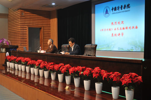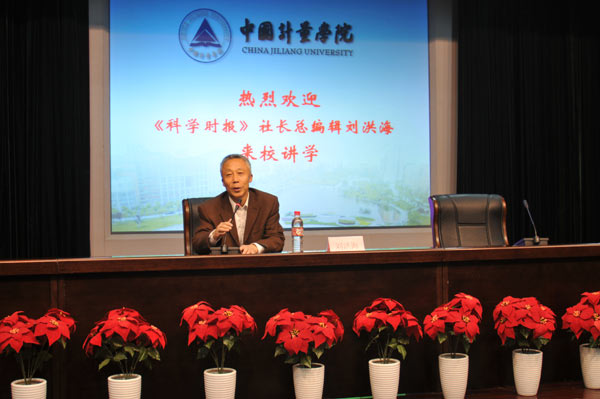 11月6日,科学时报社社长、总编辑,中国发展战略学会研究会副理事长,中国科技新闻学会副理事长刘洪海应邀来我校作专题报告。学校全体中层干部,校级以上(含校级)重点学科负责人,各民主党派负责人聆听了报告。报告会由党委副书记陶伟华主持。 刘洪海报告的主题是《关于大学文化建设的思考》。报告以全新的视角、独到的见解,从大学文化的本质、大学文化建设的五个要素、媒体为大学文化建设服务的五个功能等三个方面阐述了大学文化。整场报告观点鲜明、条理清晰、立意深远,对学校师生更好地理解大学文化、更好地建设大学文化具有十分重要的指导意义。 刘洪海指出,大学文化是一种道统文化,是一种知识文化,是一种世界文化,是一种公民文化,也是一种青春文化。在大学文化的建设中要关注五个要素,即特色化、事件化、人物化、故事化和工程化,五个要素是相互依托的关系。 对于中国我院学院的校园文化,刘洪海有着自己真实的感悟和独特的理解。他认为,学校的办学理念和一训三风都非常有特色,是学校独一无二的宝贵精神财富;量院文化建设的指导思想和整体设计都是特色化和工程化的,希望学校能够保持下去,并继续开拓。 作为一名资深的媒体人,刘洪海说,每次进入大学校园都怀有感恩之心、景仰之情和向往之意。媒体为大学文化建设服务应充分发挥出五种功能,即传播功能、策划功能、校正功能、研究功能和提升功能。 最后,刘洪海用《量院文化简明读本》中的一句“临浙江以北脊,壮沧海之宏流”结束整场报告。他衷心祝愿中国我院学院在学校党政领导的带领下,文化建设蓬勃发展,共同创造辉煌未来,为国家富强和民族振兴做出更大贡献。