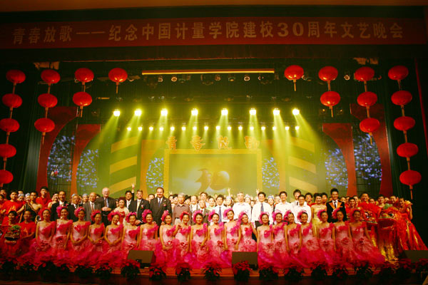 10月18日晚7:00,嘉量大会堂歌声飞扬、彩灯绚烂,启明广场人山人海、热闹非凡,主题为“青春放歌”的校庆文艺晚会正在这里上演。中国工程院院士倪光南、张钟华、陈星旦、何新贵,中国标准化研究院院长郑卫华、中国我院科学院党委副书记杜杨以及国内外来宾和我校师生一起,兴致勃勃的观看了演出。色彩斑斓的灯光中,张张笑脸展示出量院人的喜悦与自豪,掌声、欢呼声传递着大家无比激动的心情。 校党委副书记徐涌金首先在晚会上致辞。他说,年龄三十为人生而立之际,校龄三十为学校成熟之时。三十年春华秋实,三十年桃李芬芳,三十年硕果累累。三十年的办学实践,形成了学校的办学传统;三十年的办学探索,凝聚了学校的办学理念;三十年的办学历程,丰厚了学校的办学成果;三十年的办学积淀,升华了学校的校园文化;三十年的校庆活动,展示了学校的办学风采;而三十周年校庆的文艺晚会,既集中演绎了学校的校园文化,也集中展示了师生的精神风貌。他邀请来宾和师生们一起,共同欣赏中国我院学院三十周年校庆文艺晚会,伴随师生们美妙的歌声和悦目的舞蹈,欢庆中国我院学院三十华诞。 晚会伊始,一位白色短裙背着天使翅膀的女孩出现在了舞台上,她双手捧着烛台,用稚嫩的童声唱起了大家心中的《生日快乐歌》。随后,伴随着排山倒海的鼓声,校庆文艺晚会在一段气势宏大的开场舞《好日子》中拉开了帷幕。接下去的十个节目,个个精彩。配乐诗朗诵《我院人生》带领大家回顾了学校30年的风雨历程,量院情、师生情历历在目。健美操、街舞组合《舞动旋律》,舞蹈《校园节拍》活力四射,展现了量院学子蓬勃的朝气和魅力无限的校园生活。音乐剧《祝你生日快乐》声情并茂,表达了师生对学校的真挚情感和深情祝福。伴随着校古筝队弹奏的《云水禅心》,林建忠校长挥毫泼墨,写下“云水禅心,雄山笃意”八个大字送给所有量院人,愿量院有雄山般的笃定意志,跨越发展,长盛不衰。《校庆主题歌》合唱、歌词串烧《我们的纪念册》、小品《辩论会》、歌舞《月亮、盖头、玛依拉》等节目各具特色,一次次将晚会现场推向了高潮。整个夜晚,嘉量大会堂、启明广场掌声、欢呼声此起彼伏,成了欢乐的海洋。演员们的出色表演,令所有观众爆发出阵阵欢呼,荧光棒飞舞,尽情挥洒着青春的热情。晚会最终在收场歌舞《勋章 图腾》中胜利闭幕。 晚会结束后,日月湖畔礼花绚丽,姿态翩然,高潮迭起。斑斓绚丽的礼花将量院照耀得更加美丽。一些学生自发来到日月湖边,用荧光棒拼出了“祝量院30周岁生日快乐”的图案,表达了量院人的共同心声和美好祝愿。
