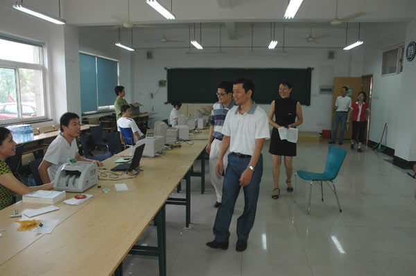 今天是2008级新生报到的第一天。早上9:00,林建忠校长、陶伟华副书记在党校办负责人的陪同下来到了迎新现场指导工作。他们走到每个摊位前,详细询问了迎新工作的准备情况和新生报到情况。林校长特地向学生处处长范庆瑜了解来自四川灾区的学生数量,并嘱咐一定要将这些学生安排好。 随后,林建忠校长、陶伟华副书记又前往东校区,检查东校区的迎新准备情况。他们向现代科技学院、后产处、现代教育技术中心、后勤服务公司等单位负责人仔细询问了迎新准备工作,并专程来到新生宿舍进行检查。