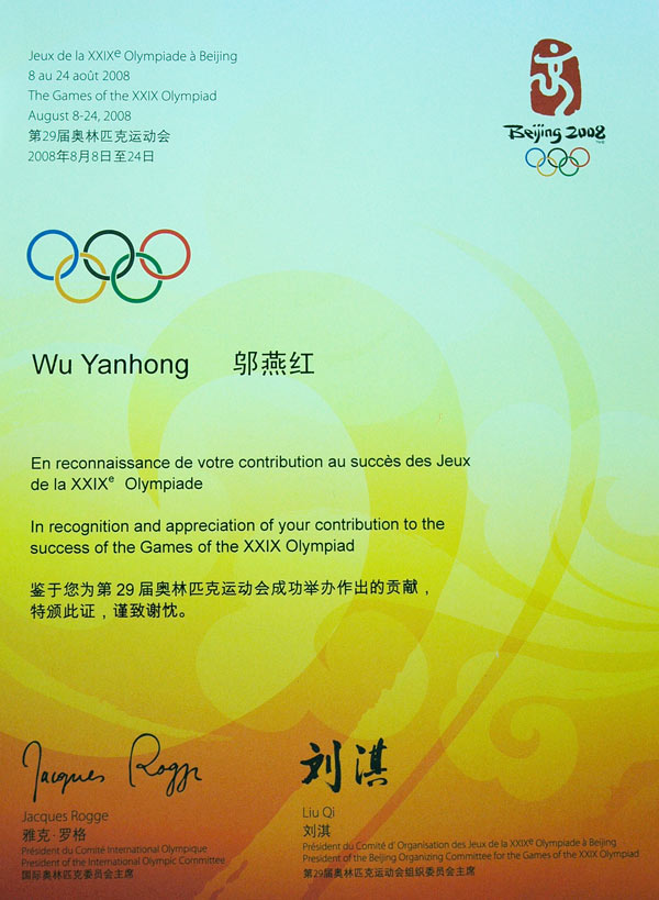 8月24日,我校体育军事部副主任邬燕红教授,代表我校全体师生,在结束了北京奥运会沙滩排球比赛裁判执法工作之后载誉归来!同时带回了国际奥林匹克委员会主席雅克•罗格、北京奥组委主席刘淇联名签署的荣誉证书。