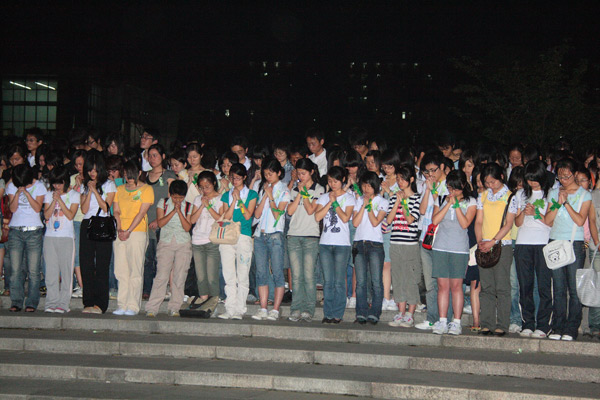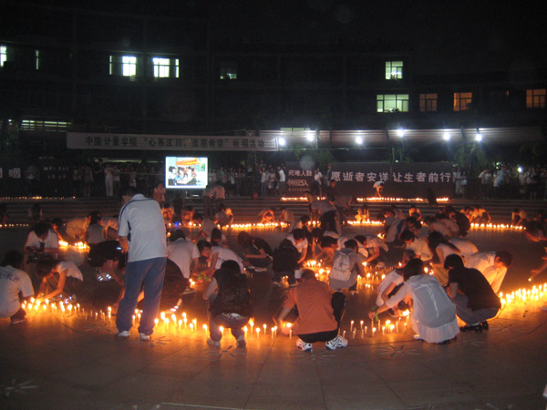 有一种灾难,你不曾经历就不知道它的痛苦; 有一种思念,你不曾感受就不知道它的深切; 有一种温情,你不曾融入就不知道它的感动。 5月21日晚19:30分,为纪念在四川地震中遇难的同胞,中国我院学院“心系汶川,点亮希望”绿丝带祈福活动在启明广场前举行。活动开始前半小时,老师和同学们就身着素装,手臂上系着为此次活动专门制作的绿丝带,自发聚集在广场。 19:30分,工作人员开始点燃象征着遇难同胞数目(按10%比例)的4007支蜡烛,硕大的心形图案里“四川加油!”醒目耀眼。大屏幕上播放着四川地震的报道,现场有人在哽咽,有人在流泪,但所有的人都紧扣十指,默默地为同胞祈福。风中,摇曳的烛光灭了又亮,宛如生命延续着希望!感动在蔓延,温暖在蔓延,量院绿丝带迎着风挺起中国的脊梁!纪念汶川遇难同胞的诗歌朗诵令人潸然泪下;“汶川,加油!”、“四川,加油!”、“中国,加油!”……广场上响彻铿锵的呐喊,用最有力的声音表达重建家园的信心! 活动现场,同学们再一次进行了献爱心募捐活动;还献上了寄托哀思的4007朵白菊花,活动结束后将以义卖鲜花的形式筹集善款捐助灾区。 21:10分左右,祈福活动顺利结束。但还有很多同学久久不愿离去,深深地鞠躬,道一声:同胞安息,汶川,我们与你在一起! 本次祈福活动共有7000余名师生自发参加。为确保祈福活动安全有序进行,活动前,我校学生自发成立了中国我院学院“心系汶川,点亮希望” 绿丝带祈福活动小组,认真做好活动的各项组织工作。