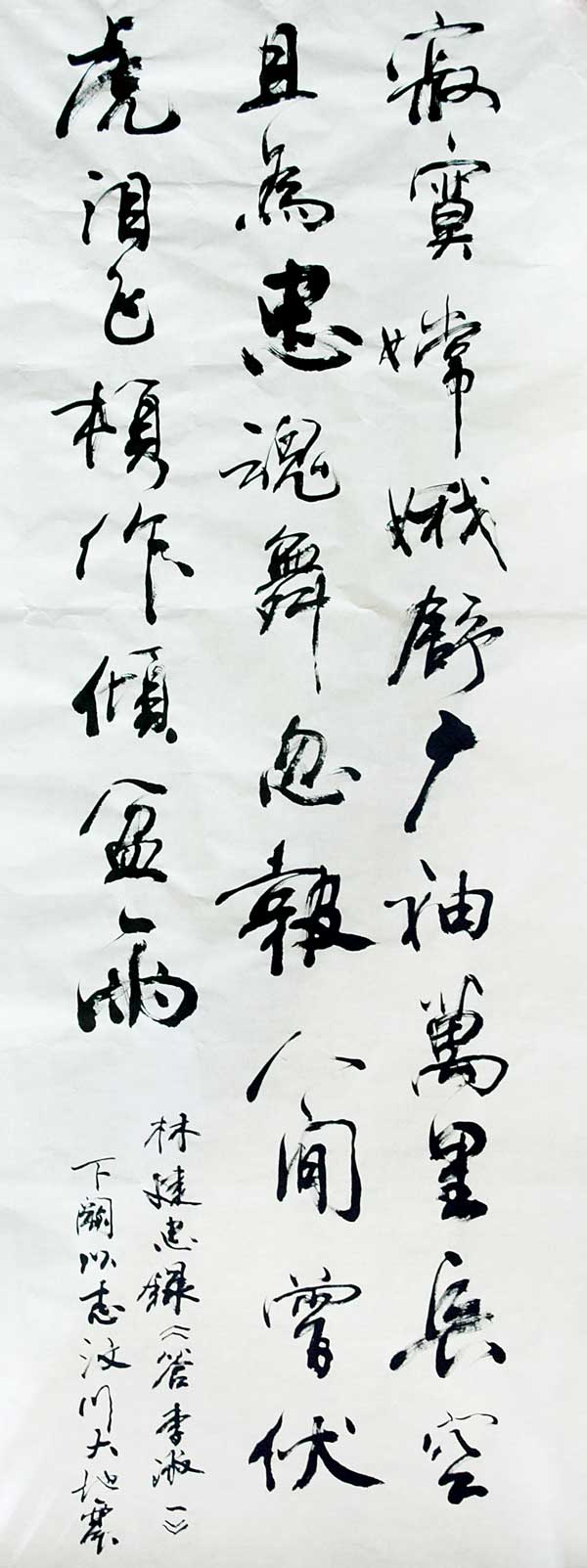 同时,林建忠校长还挥墨写下毛泽东词《蝶恋花•答李淑一》下阙:寂寞嫦娥舒广袖,万里长空且为忠魂舞。忽报人间曾伏虎,泪飞顿作倾盆雨。以此来表达哀思,抒发情怀。