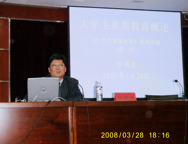 3月27日晚,我校大学生素质教育系列讲座在明德北六楼拉开帷幕,校党委副书记徐涌金为同学们作了以“大学生素质教育概述”为主题的讲座。学校部分班长、团支书以及校级学生组织的学生骨干近300人聆听了讲座。