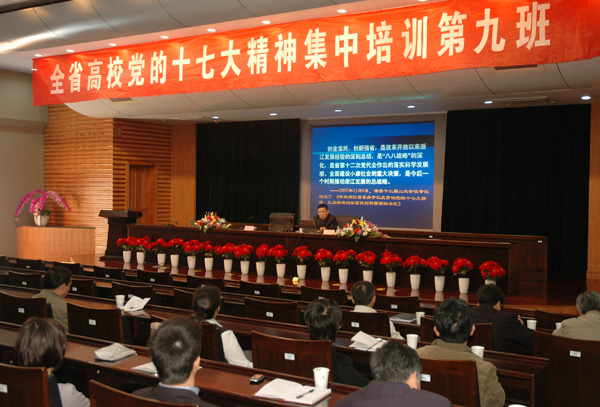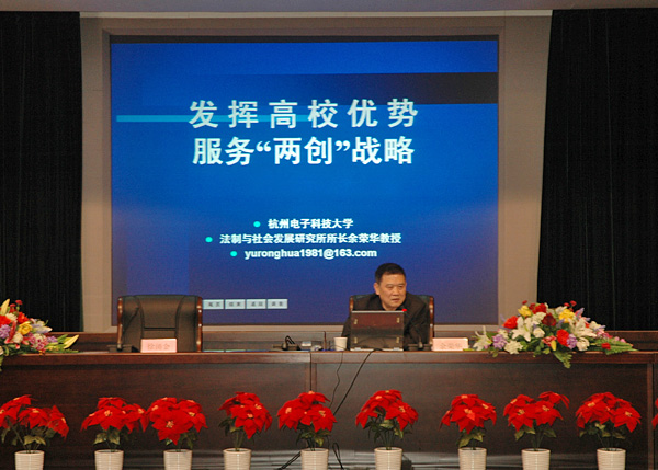 4月10日下午1:30,党的十七大精神集中培训班第三讲在闻厅二楼小报告厅举行。省委教育工委讲师团成员、杭州电子科技大学法制与社会发展研究所所长余荣华教授以“发挥高校优势,服务‘两创’战略”为题,为我校处级干部和担任党支部书记的教工上了生动的一课。会议由党委副书记徐涌金主持。 报告主要包括“两创”战略的基本内涵、“两创”战略的现实背景、实施“两创”战略的重点问题和高校在推进“两创”战略中的作用等四个方面。余教授在报告中首先阐述了全民创业、全面创新、富民、强省等 四方面“两创”战略的基本内涵,指明了“两创”战略的总体要求,实施“两创”战略的七项举措和 9个重点问题,并得出了“两创”战略是科学发展观的充分体现,是浙江经济社会发展现实的必然产物的结论。在谈到高校在推进“两创”战略中的作用时,余教授指出,一是要充分认清高校在推进“两创”战略中的自身优势 ,二是要认清高校在推进“两创”战略中的历史责任,三是要充分发挥高校在推进“两创”战略中的重要作用。余教授在最后强调,深刻理解党的十七大的历史任务,最首要的是正确把握我们党所处的历史方位,最关键的是坚定不移地走中国特色的社会主义道路,最紧要的是坚持改革开放不动摇,最重要的是深入贯彻科学发展观,最紧迫的是以改革创新的精神加强党的建设。