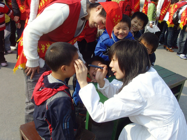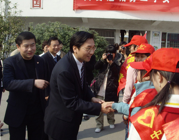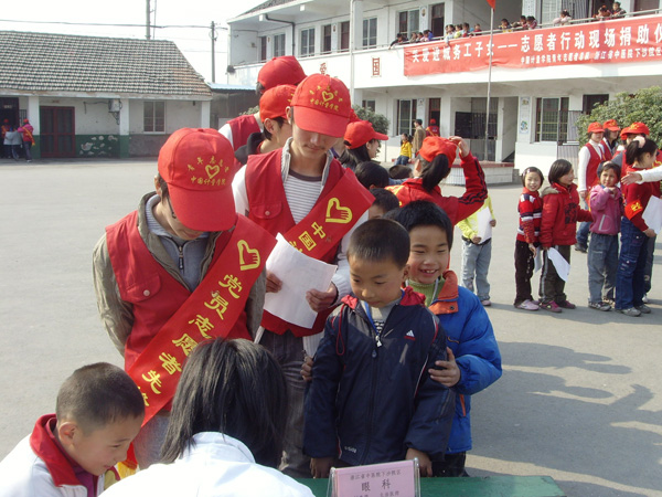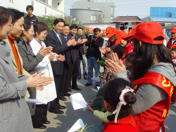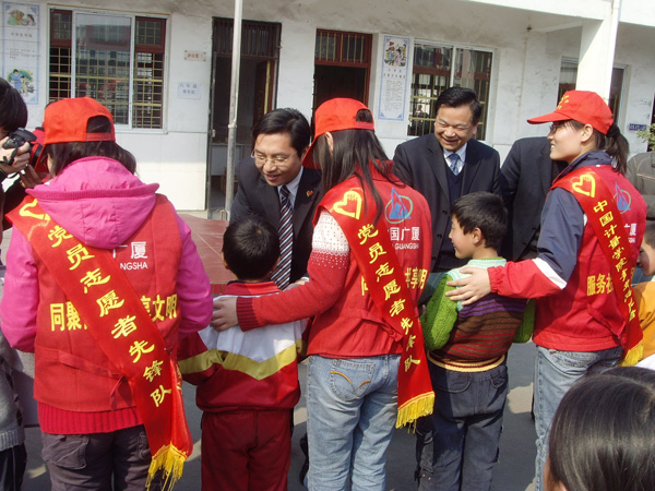 3月5日下午,在浙江省首个志愿者日之际,团省委副书记蔡永波在团省委学校部副部长王尧祥等人的陪同下看望了正在杭州经济技术开发区阳光小学进行的“‘大手牵小手’——关爱进城务工子女志愿者阳光行活动”的中国我院学院青年学生志愿者。我校副校长冯时林也代表学校专程前往阳光小学对青年学生志愿者进行了慰问。 在活动现场,团省委副书记蔡永波、冯时林副校长对我校学生志愿者致以了亲切的节日问候,并希望所有志愿者能一如既往地做好志愿服务工作,奉献社会。接着,他们还参加了“关爱进城务工子女——志愿者在行动”现场捐助仪式,为阳光小学的进城务工子女捐赠了一批儿童课外读本。当蔡永波副书记得知这些儿童课外读本都是我校志愿者不怕脏、不怕累,通过在校内回收废旧报纸筹集资金而得时,他对我校志愿者工作给予充分了肯定,并以“赠人玫瑰,手有余香”为勉。冯时林副校长也鼓励我校青年学生志愿者要积极发挥好服务社会精神,尽己所能,为进城务工子女奉献爱心,提供帮助。 今年3月5日是毛泽东同志“向雷锋同志学习”题词发表45周年纪念日,也是《浙江省志愿服务条例》正式颁布实施。我校青年志愿者总队围绕“人人争做志愿者,人人关爱志愿者”的主题,开展了一系列活动,如:通过张贴宣传海报、分发倡议书等形式,在全校师生中广泛开展学习宣传贯彻《浙江省志愿服务条例》活动;为进城务工子女提供“爱心体检”志愿服务活动,通过多方努力,争取到了下沙东方医院为阳光小学804位学生免费爱心体检的机会,并积极协助东方医院做好组织体检等相关工作;开展为期一周的“遵守交规、关爱生命”我校师生交通维序活动;关爱下沙阳光小学进城务工子女,在校内开展废旧报纸回收活动,筹集捐赠基金;打造国内最清洁的经济技术开发区清洁行动,组织青年学生志愿者走上街头,开展清洁行动。