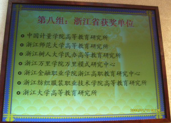 中国高等教育学会组织评选第二届全国优秀高等教育研究机构的结果于近日揭晓,根据《关于表彰全国第二届优秀高等教育研究机构的决定》(高学会[2008] 2号),我校高等教育研究所被评选为第二届全国优秀高等教育研究机构,这是我校高教研究所继2005年荣获全国首届优秀高等教育研究机构称号后的又一殊荣。 据悉,在此次评选中,中国高等教育学会严格控制比例,获奖单位数只达到申报总数的5%。浙江省有七所高校的教研机构荣获此次荣誉称号,我校高教研究所排名第一。另六所教研机构所在高校分别为1所211高校、1所师范院校、2所民办高校和两所高职院校。而同时荣获首届和第二届全国优秀高等教育研究机构的只有浙江树人大学民办高等教育研究所和我校高等教育研究所。高教研究所所长李丹青研究员近日赴北京参加了颁奖大会并参与到了中国高教学会重大课题《遵循科学发展,建设高等教育强国》及“高等教育学专业研究生教学系列用书”的相关工作。