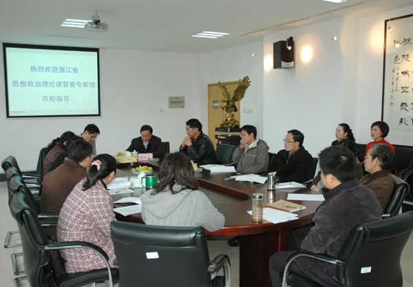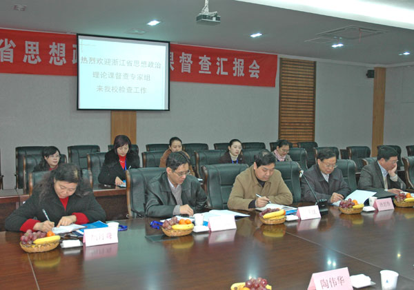 12月12日,受省委教育工委和省教育厅委派,以王来法教授为组长、陈雷、唐思鲁、胡丹鸯、沈瑞云为组员的专家组对我校思想政治理论课建设工作进行督查。党委书记于永明、校长林建忠、党委副书记徐涌金等学校领导分别会见了专家组成员。 在思想政治理论课建设督查汇报会上,徐涌金副书记介绍了我校思想政治理论课建设的基本情况。他指出,学校对思想政治理论课建设高度重视,出台了《关于进一步加强思想政治理论课建设的若干意见》等文件,并对照《浙江省高等学校思想政治理论课建设标准》积极推进思想政治理论课程的建设工作。他希望通过各位专家的督查,促使我校以更高的标准、更快的速度和更大的力度建设好思想政治理论课,努力开创学生思想政治教育工作新局面。会上,人文社科学院详细汇报了我校思想政治理论课建设自查情况。校思想政治理论课建设领导小组成员、人文社科学院领导及思想政治理论课骨干教师参加了汇报会。 在整个督查过程中,专家组通过听取汇报、实地考察、听课、召开教师座谈会、查阅资料等形式,深入考察了我校的思想政治理论课建设情况。 反馈会于当天下午举行,我校党委书记于永明、党委副书记徐涌金出席会议。督查组组长王来法教授代表督查组就检查情况作了反馈。王来法充分肯定了我校思想政治理论课的建设情况,对课堂教学质量给予了高度评价。他指出,学校领导对于思想政治理论课有着深刻的认知和清晰的要求,党委和行政领导高度重视,真正做到了齐抓共管;学校为思想政治理论课建设制定了科学的规划,在教学组织、队伍建设、保障条件等方面做了大量的工作,取得了很好的成效。王来法希望学校能进一步强化队伍建设,提升科研水平,推进思想政治理论课建设工作。 在听取了专家组的反馈意见后,徐涌金对督查组专家的辛勤工作表示感谢,并表示要将专家组对学校的肯定当成一种鼓励和鞭策,对专家提出的问题,学校将积极整改,严格对照建设标准要求和专家的反馈意见,进一步做好思想政治理论课的建设工作。 据悉,在督查中,专家组还参观了学校办学成果展、心理咨询中心和人文社科学院档案室,专家们对我校在心理咨询工作上所取得的成绩给予了高度评价,充分肯定了心理咨询工作对于加强大学生思想政治教育工作的重要意义;对人文社科学院档案管理及思想政治理论课督查材料的准备、归档工作了给予充分肯定。