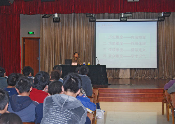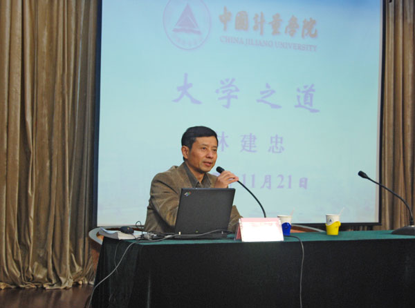 讲座中,林校长从儒学的思想角度,分别从历史、功用、传统、受众等四个维度介绍和阐述了大学的形成、内涵及其在科学发展和社会进步中的作用。他指出,大学之道,在明德,在亲民,在止于至善。真正的大学之道,在于大学生能否明白那颗晶莹透明的真心,在于能否用真心去对待身边每一个生命,在于能否达到本性纯洁的至善境界。接着,林校长通过列举马克思、达尔文、牛顿、华罗庚等名人的例子,分别从学、才、识、气四个方面对大学生提出了要求:学即指知识,才即指能力,识即指素质,气即指文化;作为一名合格的大学生,应当注重学习,勤奋为本,精读博览,注重积累,以增长知识;应当才具事成,灵活运用,洞察秋毫,以培养能力;应唯物辩证,审时度势,推陈出新,敢为人先,学会说不,善抓本质,以提高素质;应从善如流,经世济民,上善若水,潇洒大气,以提升文化。另外,林校长还介绍了我院的基本知识以及中国我院学院的地位和作用,让同学们更加了解我校的校史、校情和校风,增强了同学们的爱校荣校的归属感与责任感。