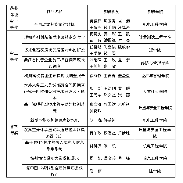 6月9日至6月10日,浙江省第十届“挑战杯”大学生课外学术科技作品竞赛决赛在浙江理工大学举行,经过全体队员和指导教师的共同努力,我校共获得一等奖一项,二等奖四项,三等奖七项的好成绩,是我校参加大学生课外学术科技作品竞赛以来获奖数量最多的一次。同时,我校还获得了本届“挑战杯”竞赛的“最佳进步奖”,其中全自动鸡胚疫苗注射机将代表浙江省参加全国“挑战杯”决赛。