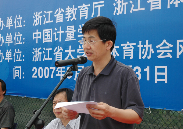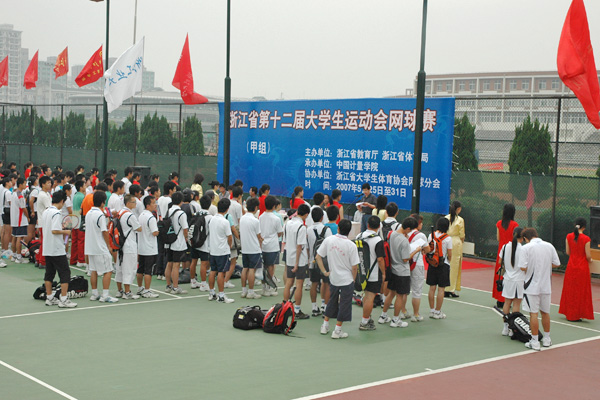 5月26日上午,2007年浙江省第十二届大学生运动会网球比赛开幕式在我校举行,省教育厅副厅长鲍学军、副校长侯宇出席了开幕式。省教育厅体卫艺处处长王志泉、省教育厅体卫艺处副处长、省大学生体协秘书长徐剑津、省大学生网球协会主席姜建华参加了开幕式。开幕式由体军部主任季建成主持。 侯宇副校长在致辞中代表学校向本届网球赛的顺利召开表示热烈的祝贺,并希望全体运动员要发扬“更高、更快、更强”的奥运精神,顽强拼搏,奋勇争先,以高昂的斗志、高超的球艺,赛出友谊,赛出风格,赛出水平,以赛事为平台,充分展示院校风采。他表示,只要大家团结一心,共同努力,在上级领导的亲切关怀和大赛组委会的精心组织下,本次网球赛一定会获得圆满成功! 省教育厅副厅长鲍学军宣布浙江省第十二届大学生运动会网球比赛正式开始并为比赛开球。 浙江省第十二届大学生运动会网球比赛是由浙江省教育厅、浙江省体育局主办,由我校和浙江理工大学承办的一项重要赛事,共有二十一所高校近80名运动员参加。参赛的各代表队运动员都是全省本科院校网球运动的佼佼者。