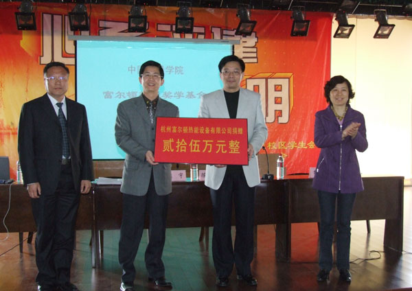 捐赠仪式上,侯宇副校长代表学校与杭州富尔顿热能有限公司签署了捐赠协议书。自捐赠协议书签订之日起,杭州富尔顿热能有限公司每年将为中国我院学院我院测试工程学院捐款五万元,为期五年。此项奖学基金将重点用于我院测试工程学院热能专业优秀学生及勤学上进、品学兼优的贫困生。