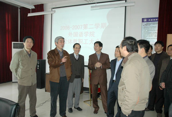 今天是3月3日,是新学期教职工上班的第一天,气温回升,校园里一副春意盎然的景象。上午9点,姚盛德、林建忠、于永明、徐涌金、张硕年、侯宇、蒋家新、冯时林等学校领导以及党委委员、党校办主任陶伟华一行来到我院技术工程学院、信息工程学院、机电工程学院、管理学院、理学院、法学院、生命科学学院、人文社科学院、外国语学院、体军部、成教学院等教学单位,向教职员工们进行了新春慰问。学校领导对大家的工作给予了充分肯定,向各教学单位的教职工表示新年的问候,并对新学期的工作提出了要求和希望。