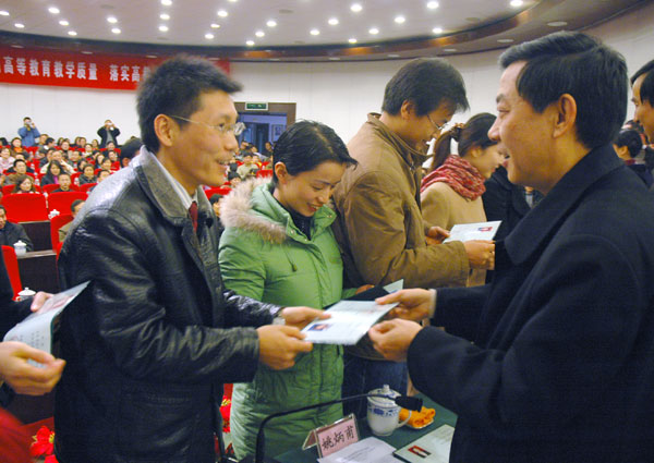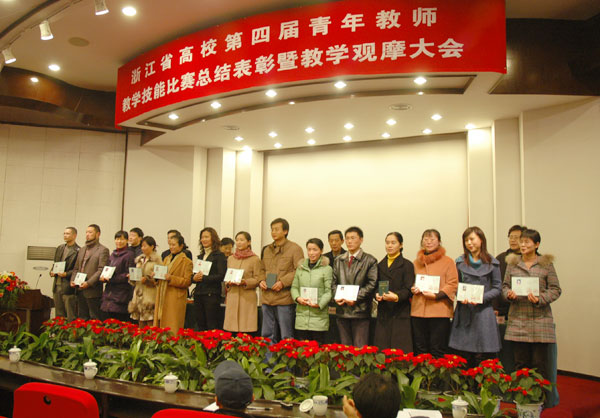 2006年12月30日下午浙江省教育厅、浙江省教育工会在浙江大学玉泉校区邵逸夫科技馆召开第四届青年教师教学技能比赛总结表彰暨教学观摩大会。 会议对浙江省高校第四届青年教师教学技能比赛优秀奖获得者进行了表彰。我校机电工程学院赵明岩、法学院刘瑾、我院技术工程学院谢代梁、外国语学院张燕子等四位青年教师被评为“浙江省高校第四届青年教师教学技能比赛优秀奖”。 会上,浙江大学和我校机电工程学院赵明岩,应邀作为第四届青年教师教学技能比赛优秀奖选手向与会代表进行了教学演示,受到了与会代表的充分肯定和赞许。