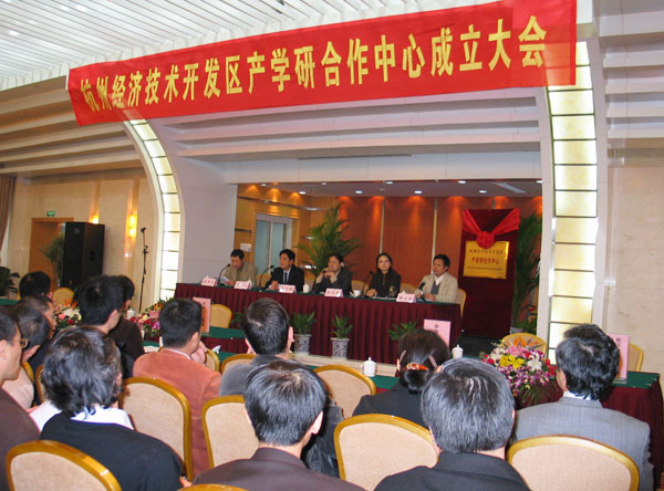 杭州经济技术开发区产学研合作中心是省内首个国家级开发区独立设置的产学研合作机构,开发区将通过积极构建企业、高校及科研机构、科技中介和政府间合作的“四位一体”新型合作创新机制,努力打造成全国一流的产学研合作基地。中心集聚了区内700余家企业与包括我校在内的14所大学的知识、科技、研发、产业诸优势,着力增强自主创新能力而创建的区域科技创新服务平台。