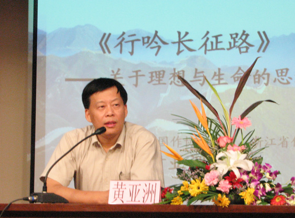 黄亚洲先生以诙谐幽默的语言讲述了自己对于理想和人生的思考与感受,并回顾了自己文学创作的历程,介绍了诗歌对于他的重要影响。他说,诗歌是民族精神的旗帜和号角,激励和振奋着一代又一代的人。随后他结合他的新诗集《行吟长征路》为同学们介绍了不久前率领部分作家重走长征路的经历和感想,并即兴为大家朗诵了诗集中的《血战湘江》、《毛泽东的担架》、《草地》等数首诗歌,同学们深深地被黄老师重走长征路的经历所感染,同时也再一次重温了长征精神。