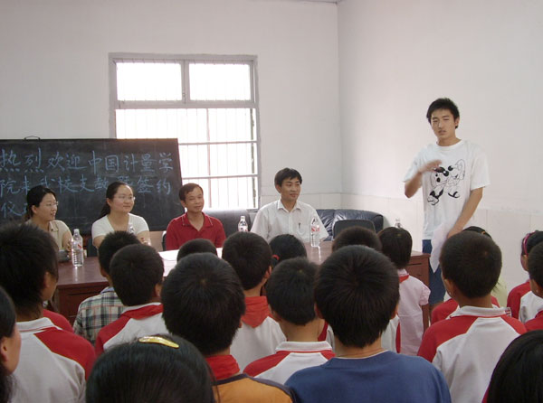 在阳光小学专门举行的签约仪式上,校团委副书记王勤与阳光小学的筹建人岑伟东董事长一起签定了共建协议。王勤老师代表团委对阳光小学的领导和师生表示感谢,同时也对参加支教服务的青年志愿者提出了三点要求,要求志愿者们珍惜实践机会,圆满完成支教任务,利用课余的时间自学一些教育学、心理学的相关知识,校青年志愿者总队要在精心选拔志愿者的同时为他们安排一些相关的讲座、培训,通过每一名志愿者认认真真准备每一次教学方案,踏踏实实开展每一次支教活动,确保支教任务的圆满完成。要求志愿者们持之以恒,坚持不懈,通过一批又一批志愿者的爱心接力,把这项支教的服务坚持下来。要求志愿者们发扬我校青年志愿者总队的光荣传统,在实践中展现量院学子的风采。 我校青年志愿者总队是一支光荣的志愿服务队伍,曾经囊括了省、市各类志愿者活动的奖项,在以往的志愿服务活动中,表现出严守经律、无私奉献的良好作风。希望在阳光小学这个实践基地的服务全过程中,我们的每一名志愿者能够发扬总队的这些光荣传统,把这个实践基地也建设成为符合省优标准的服务基地。