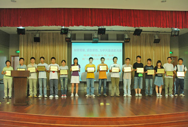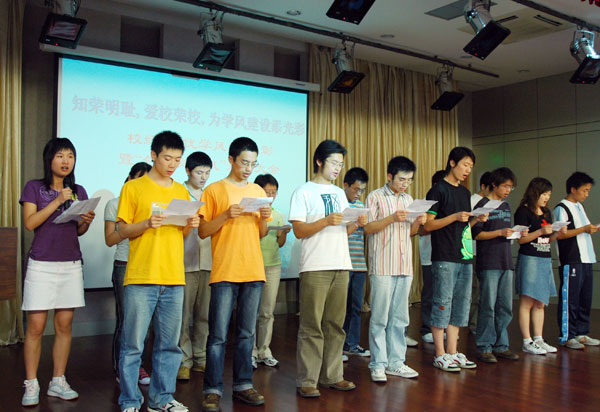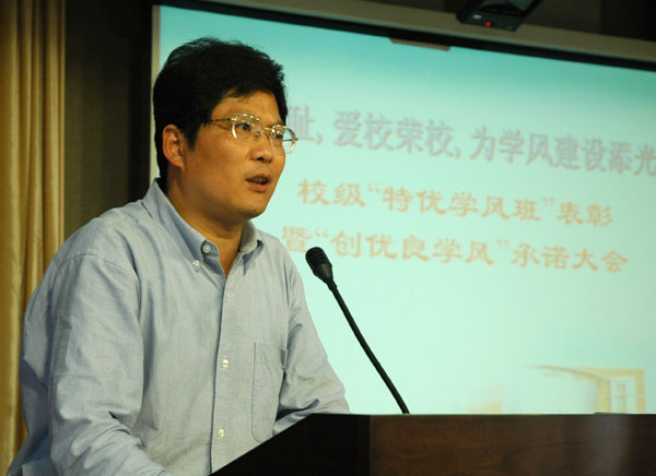 今年是我校本科教学“迎评创优”年,为了营造良好的学风、创建优良的校风,校党委学工部在全校开展了“知荣明耻,爱校荣校,为学风建设添光彩”为主体的学风建设活动。6月2日晚6:00,我校在方圆南楼五楼多功能厅举行知荣明耻,爱校荣校,为学风建设添光彩——校级“特优学风班”表彰暨“创优良学风”承诺大会。学校党委副书记徐涌金、各二级学院分管学生工作党总支书记、辅导员、全校各班级学生代表参加了大会。大会由学生处处长金国雄主持。 大会首先由校学风建设领导小组成员量新学院党总支书记巢岺老师宣布《关于表彰2004-2005学年校级特优学风班的决定》,徐涌金副书记为特优学风班颁发奖牌和奖金。 接着,校特优学风班学生代表特优学风班全体同学向全校师生做出了“知荣明耻,爱校荣校,为学风建设添光彩”的学风建设承诺,承诺从小事做起、从点滴做起,自觉遵守校级校规,严格遵守《中国我院学院学生课堂规范》。 校特优学风班代表还向全校同学发出了学风建设倡议,倡议全校同学“从现在做起,从自己做起,从严要求,营造良好学风,创建文明校风,以饱满的热情和积极向上的精神风貌迎接教育部本科教学评估”。获得2004-2005学年校级“优良学风班”的班级学生代表做出了响应学风建设倡议的发言。 最后,校党委副书记徐涌金在大会上发表讲话。徐书记指出,学校长期以来一直高度重视学风建设工作,不断探索学风建设的有效途径,积累了很多好的经验。学风建设对于学校的发展和学生个人的发展都起到了重要的作用。首先,学校和学生都要对学风建设引起高度重视。对学校来说,学风建设是学校培养高层合格人才的需要,是创建国内知名的教学研究型大学的需要,也是学校迎评创优的需要;对学生来说,学风建设是学生顺利完成学业的需要,是增强学生综合素质的需要,也是学生健康成长成材的需要。因此,今天的大会既是一个校级特优学风班的表彰大会,也是一个创优良学风的承诺大会,更是一个以评促建、评建结合、重在建设,以实际行动加强学风建设,迎接教育部本科教学工作水平的誓师大会。其次,学校和学生都要主动参与学风建设、加强学风建设。学校要对全校学生加强引导,从入学教育着眼、从制度机制着力、从班风寝风着手,致力于形成学风建设的良性循环;广大学生要从自己做起、从点点滴滴做起,共同营造良好的学习风气。最后,他希望全校学生能以“知荣明耻、爱校荣校”为己任,在教育部对我校的本科教学评估中起到更好的作用。