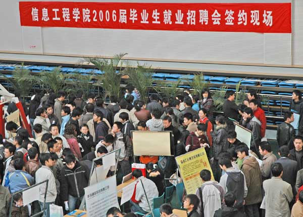12月5日清晨,寒气逼人,但寒冷挡不住毕业生求职的热情,数千名毕业生抱着厚厚的简历,排着长队等候在中国我院学院体育馆外,参加信息工程学院举办的2006届毕业生就业招聘会。 据悉,全国2006届毕业生达到420万,其中浙江省生源的毕业生高达17.6万,加上2005年及以前仍未就业的部分毕业生,明年需要就业的毕业生将突破20万人。毕业生数量增多,而社会能提供给毕业生的就业岗位却没有显著增加,2006届毕业生的就业形势依然严峻。继成功举办2004届、2005届毕业生就业招聘会后,信息工程学院今年又再次举办2006届毕业生就业招聘会。 上午8:30,用人单位陆续来到体育馆报到,体育馆门前早已人头攒动,毕业生早早来到招聘现场,等待用人单位的到来。9:30,招聘会正式开始,NEC、东忠软件、浙大网新等100多家用人单位齐聚体育馆,校党委副书记徐涌金、宣传部部长毕晓光、校团委书记巢老师、学生处副处长邵文均亲临招聘现场。 在这场招聘会前,杭州摩托罗拉移动通信设备有限公司、上海中和软件有限公司、恒生电子股份有限公司、德信无线通讯科技有限公司、浙江网新恩普软件有限公司、上海考思软件有限公司等企业便陆续到中国我院学院召开宣讲会,提前招揽优秀毕业生。即将在杭州设立分公司的世界500强印度塔塔公司也早早从参加面试的26名学生中选中了15名。 对于这种以二级学院为单位来举办大型招聘会的模式,接受采访的大学生给予了充分的肯定。不少毕业生说,每参加一次招聘会,都累得像脱了一层皮,效果还未必很好,像这样自己学院联系单位来学校举办招聘会,把招聘会开到家门口,不仅有很多单位都是专业对口的,而且节约了找工作的时间和成本。 “这不仅仅是一场招聘会。我们要借助毕业生就业招聘会来推动校企合作。”这是学院领导的新思路。招聘会期间,学院与用人单位就“目前如何更有效地建构校企联合的育人模式,进一步深化双方合作的效益问题”进行了有益的探讨。双方都深刻认识到,随着高等教育的社会应用性意义日益突显,必须在两者之间建构起互相合作、互利互惠、共同发展的联系,才能保证学校培养人和企业使用人的有效接轨。 上午十点,在招聘会现场,50多名校企联合培养出来的毕业生就与NEC、东忠软件、上海考思软件有限公司等企业现场签约。